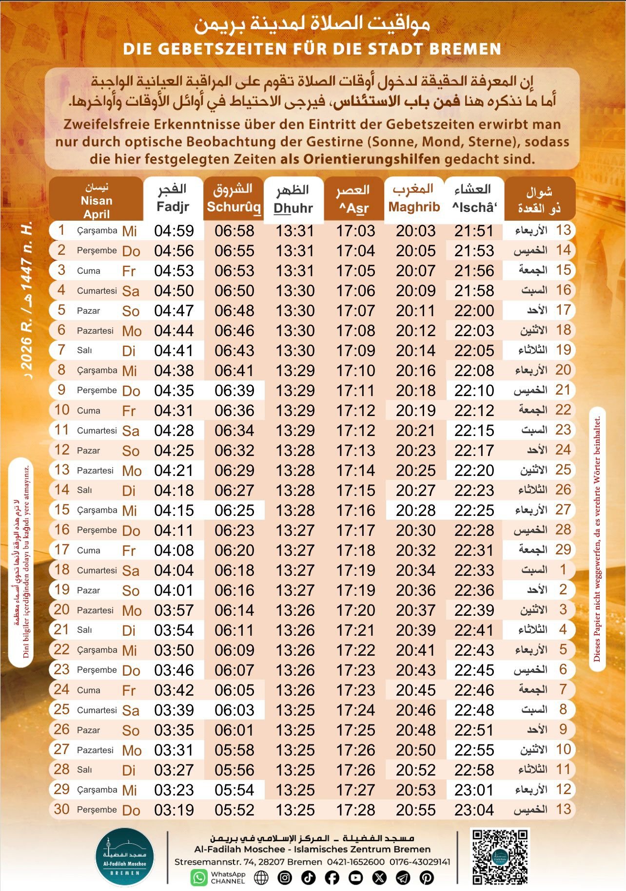 Die hier festgelegten Zeiten sind nur als Orientierungshilfen gedacht.إن المعرفة الحقيقية لدخول أوقات الصلاة تقوم على المراقبة العيانية الواجبة